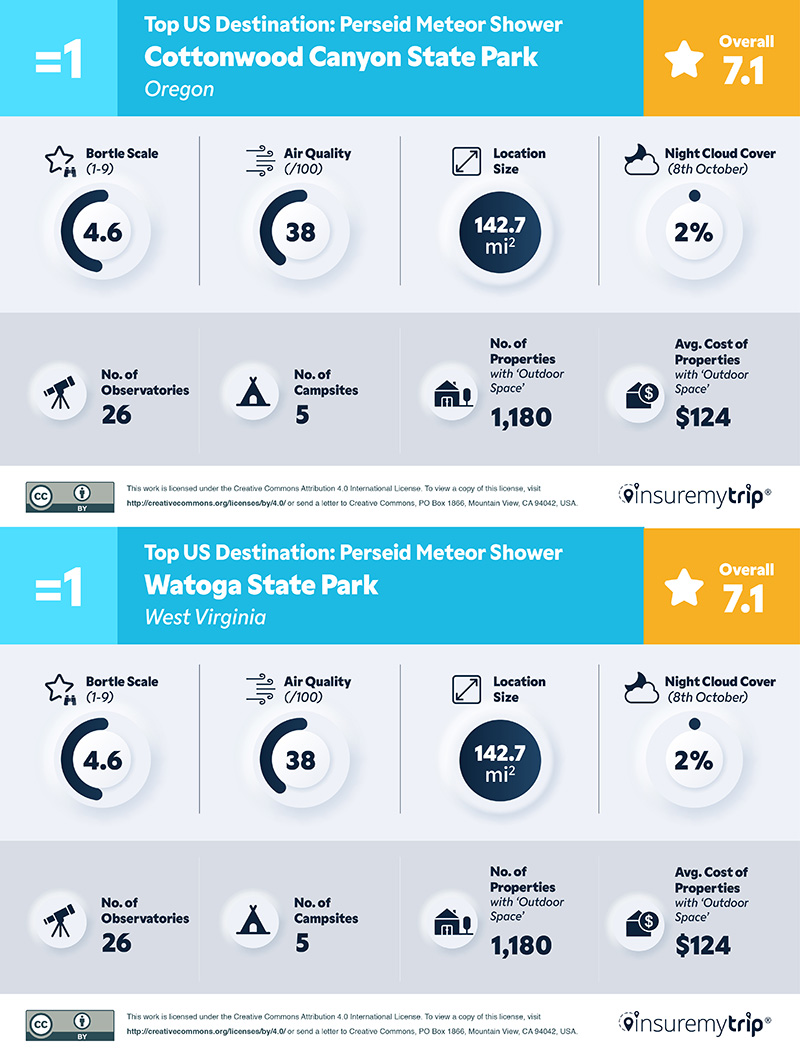 Cottonwood Canyon State Park and Watoga State Park are tied as the best destinations to view the Perseid meteor shower.