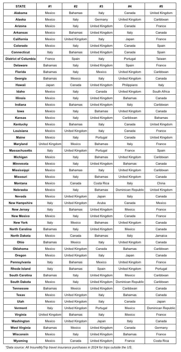 - Italy is a popular destination for 2024 – making the top 5 for every state except Oklahoma, Tennessee, West Virginia, and Wyoming.